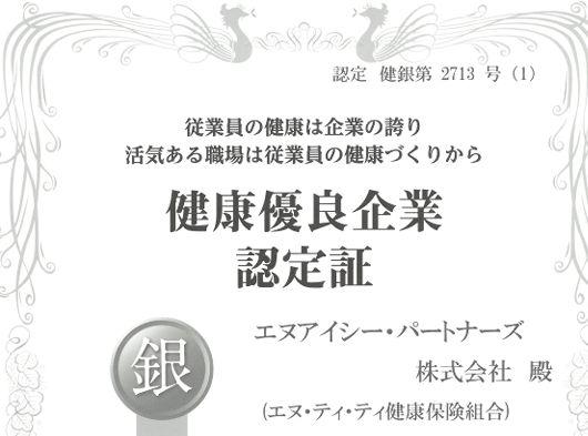 エヌアイシー・パートナーズ株式会社は健康企業宣言を行い、従業員の健康づくりを積極的に行ったことが評価され、健康保険組合連合会より健康優良企業として認定されました。