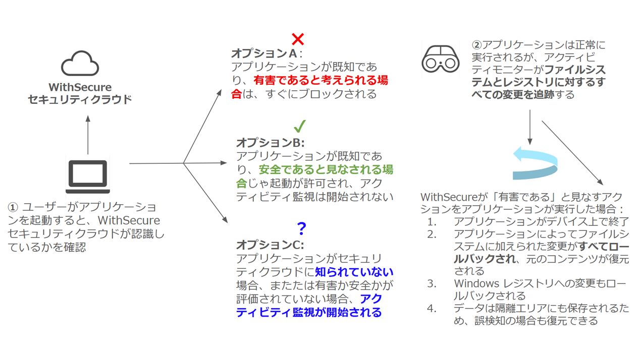この一連の処理によって「暗号化されても元に戻す」ことが可能となります。 - ふるまい検知