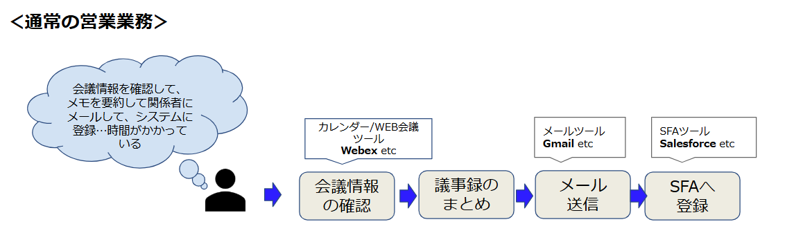 通常では以下の図の様に、打ち合わせ後に人力で会議ツールから会議情報を取得し、メモを議事録としてまとめ、メールツールを起動して関係者へメールを送信し、その後 SFA へ議事録を登録する、という流れになるかと思いますが、このような作業は時間がかかるうえに日常業務の中でも頻繁に発生します。