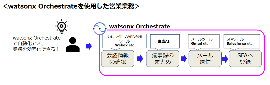 watsonx Orchestrate を使用すると、チャットに「議事録の作成と送信」と入力するだけで、会議ツールから情報を取得、議事録をまとめ、メールのドラフトを作成、SFA への登録を実行するため、作業時間の短縮と情報の共有、SFA への登録忘れの防止、コピー&ペーストミスの低減ができます。