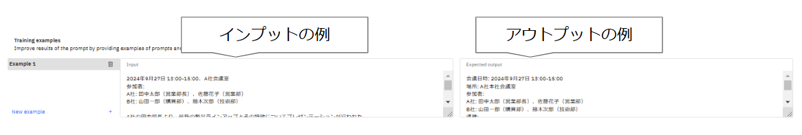 「New example +」をクリックし、インプットとアウトプットの例をそれぞれ入力します。