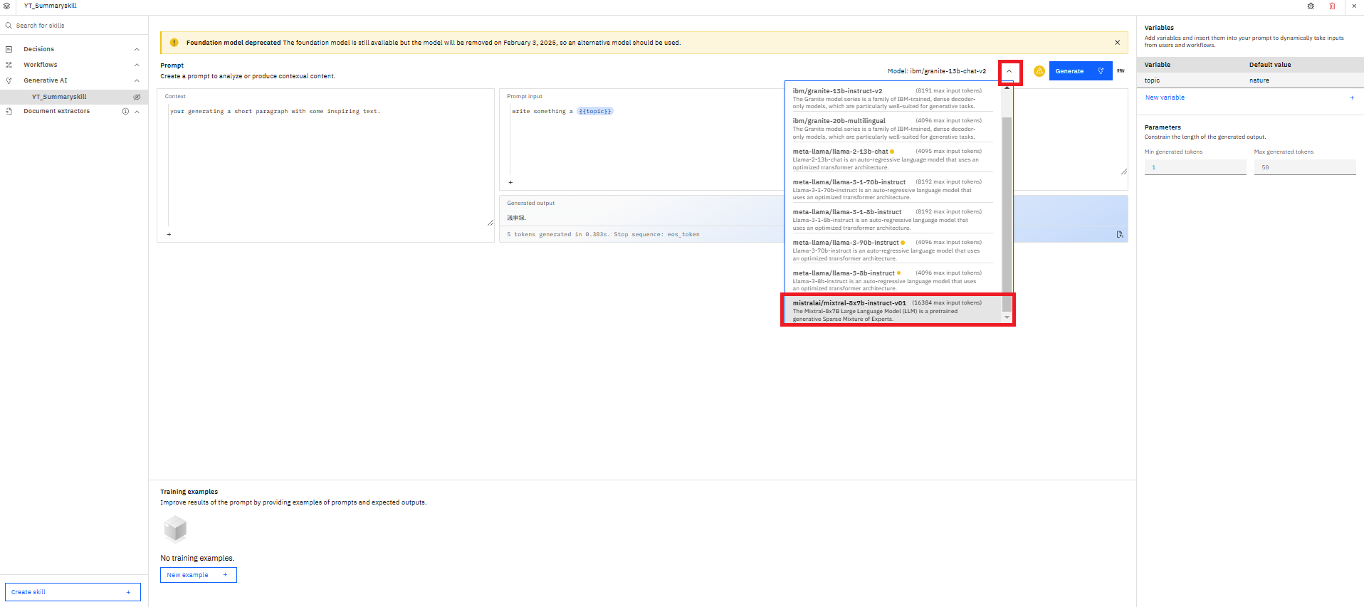 以下の画面が表示されます。デフォルトで選択している言語モデルは利用可能期限が近いため、画面上部に “Foundation model deprecated~” とアテンションが表示されています。