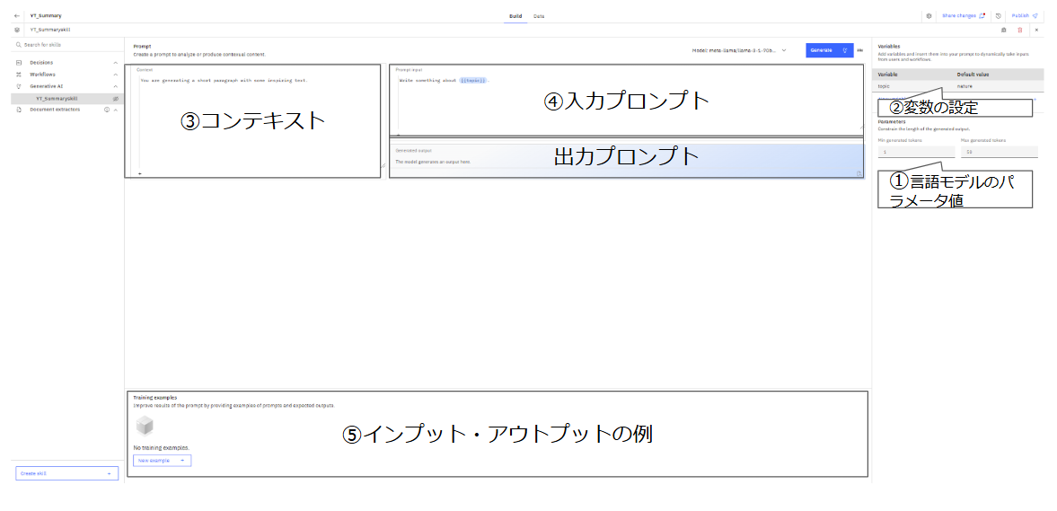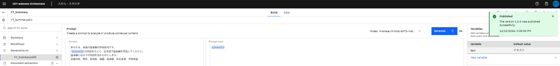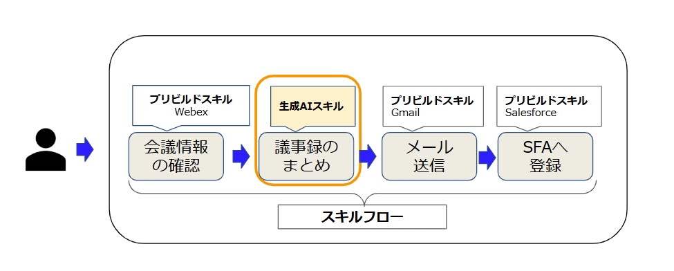 まずはじめに、議事録をまとめる生成AIスキルを作成します。(以下の図オレンジ色の枠部分)