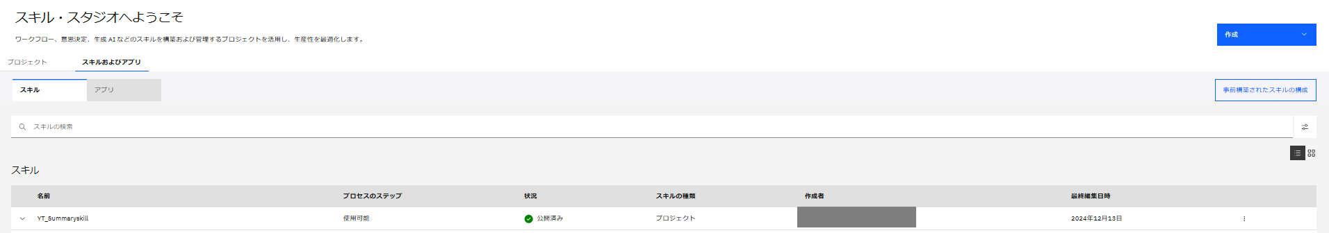 (当検証では「イニシャル_Summaryskill」と入力しています。) - 入力後「Create」をクリック