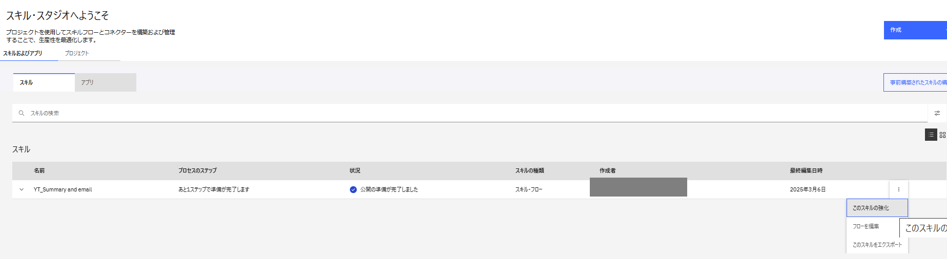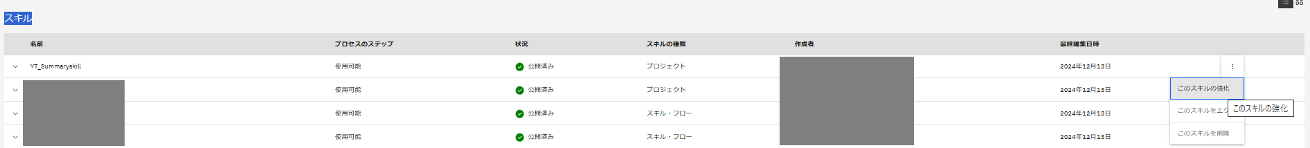 - スキル一覧に作成したスキルの状況が「公開済み」となっていることを確認後、スキルの右側をクリックし「このスキルの強化」を選択