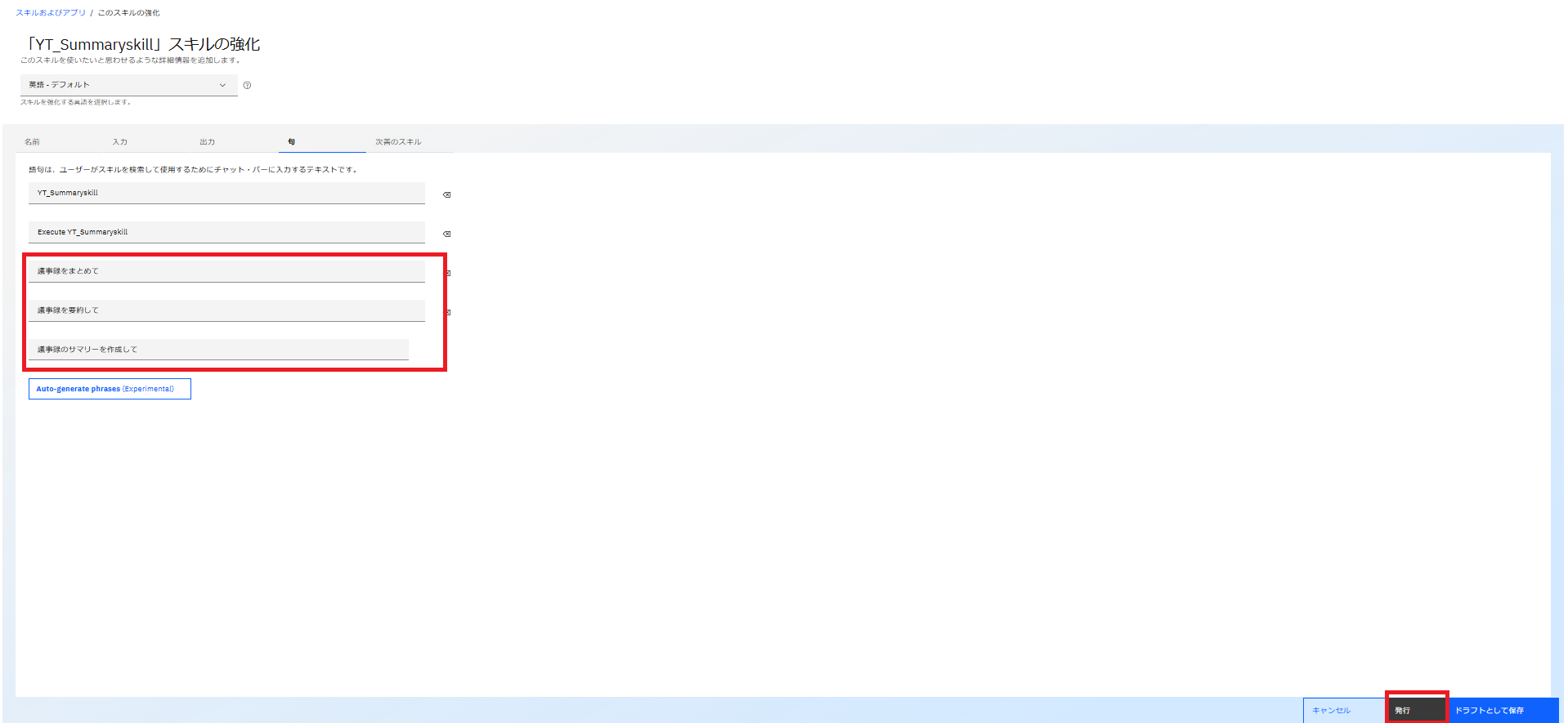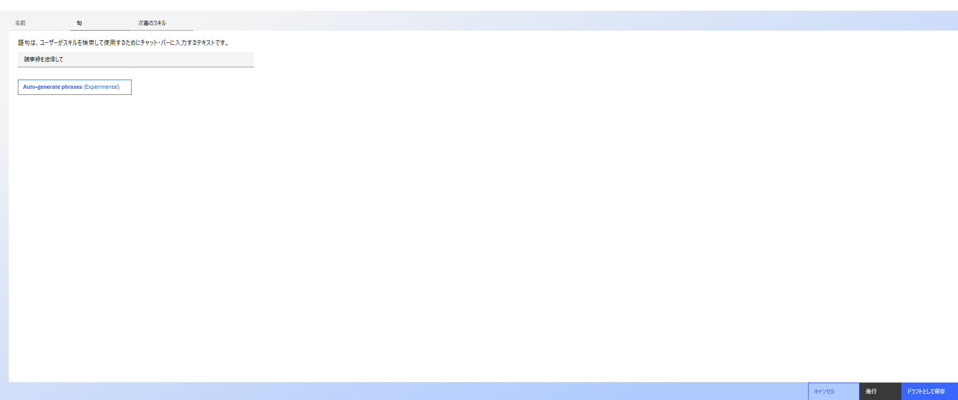 ここではスキルを実行する際の入力項目、出力項目、呼び出すためのフレーズを設定できます。今回は句タブでスキルを呼び出すフレーズのみ設定します。