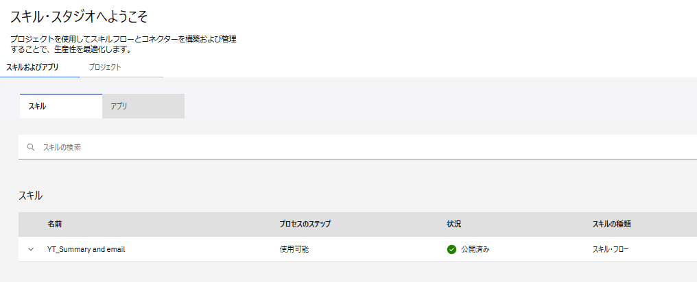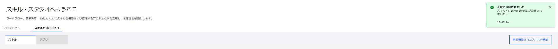 - 「スキル・スタジオへようこそ」画面にて、「スキルおよびアプリ」を選択