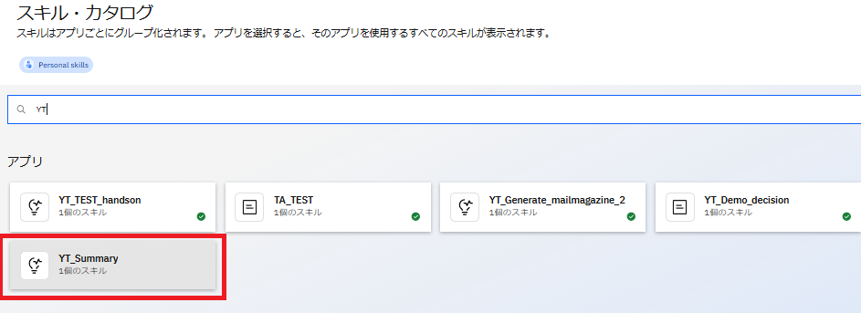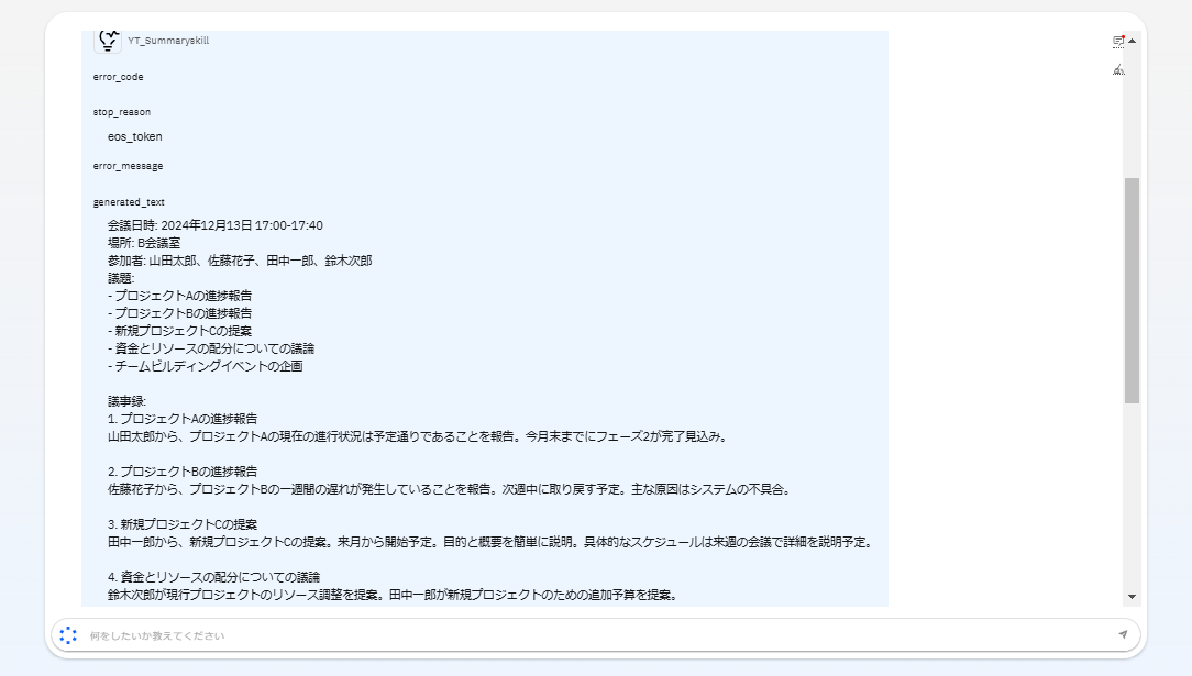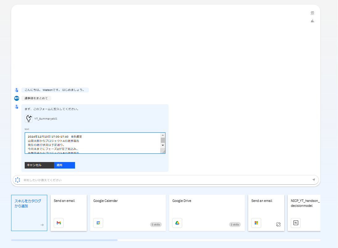 (当検証では「議事録をまとめて」と入力しています。) - 呼び出されたスキルを選択