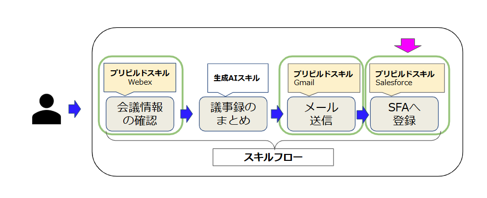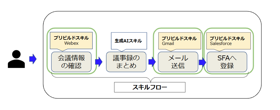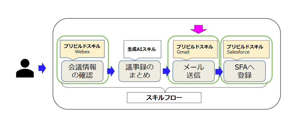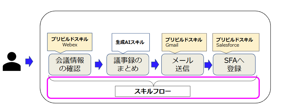生成AIスキルと複数のプリビルドスキルを繋げたスキルフローを作成します。(以下の図ピンク色の枠部分)