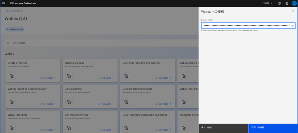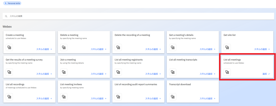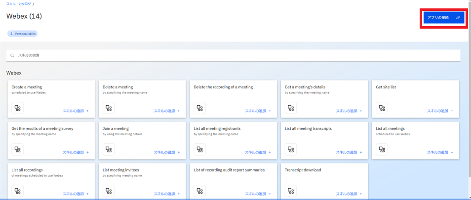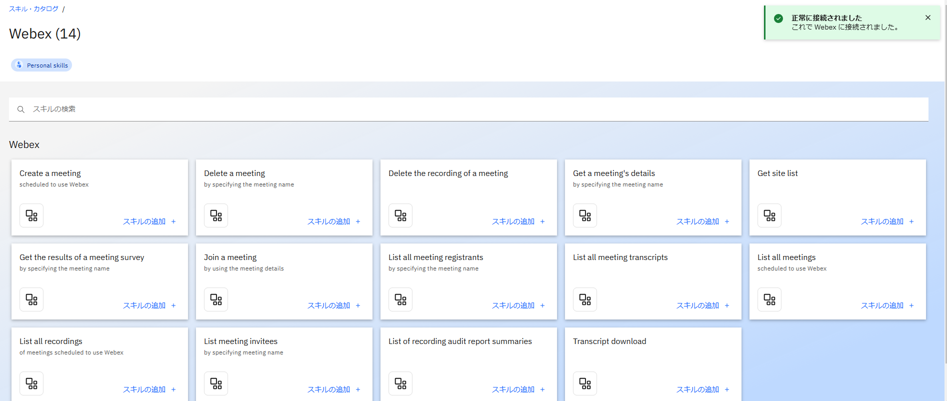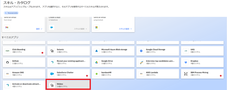 - メニューバーから「スキルカタログ」を選択し、Webexのタイルをクリック