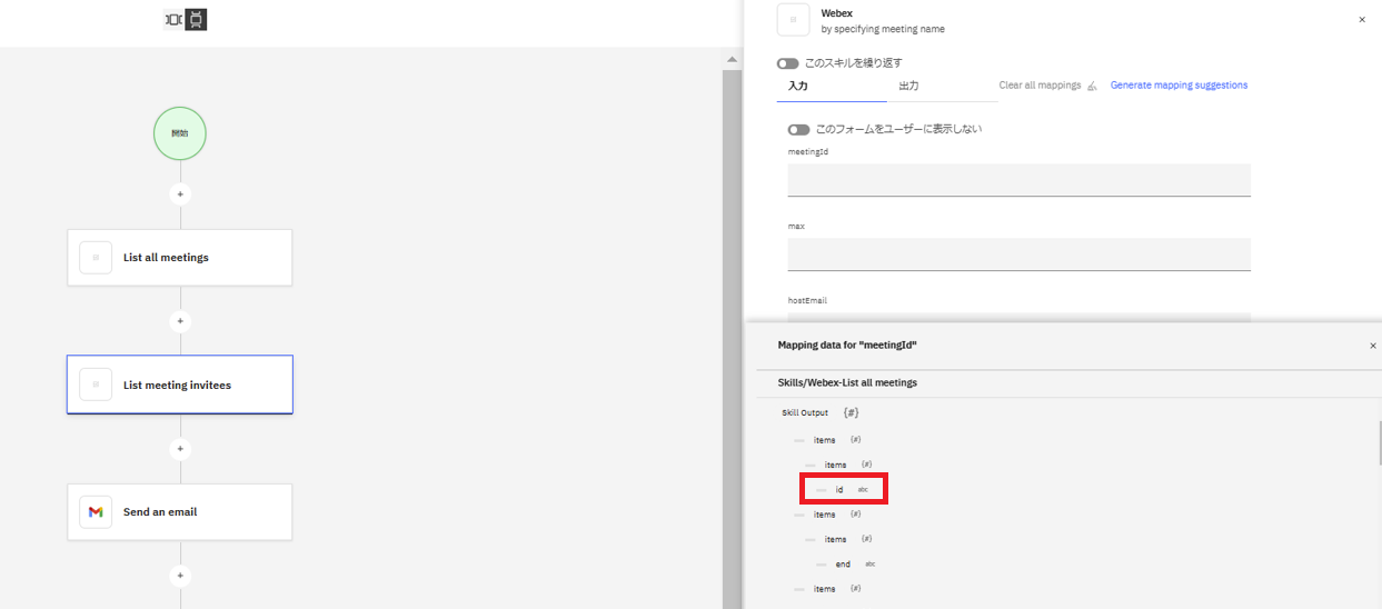 - 右側に表示された入力時の引数設定画面meetingId欄にて、List all meetingsスキルから得られる値を選択