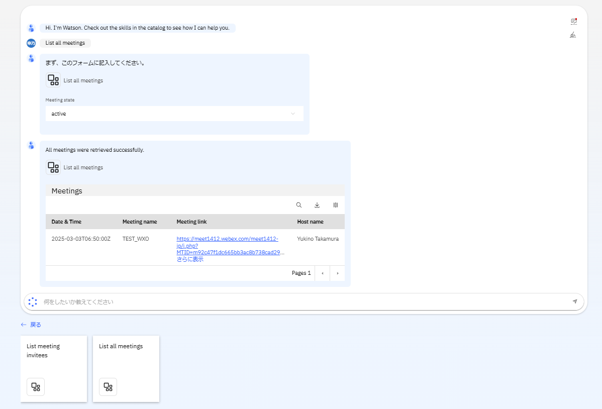 Webex の2つのプリビルドスキルをチャットから呼び出すことができるか確認します。