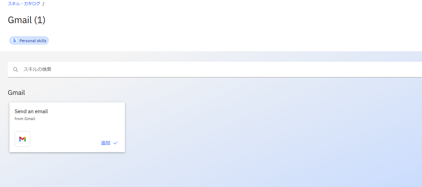 次に、議事録送信するための、Gmail の Send a email のプリビルドスキルを追加します。