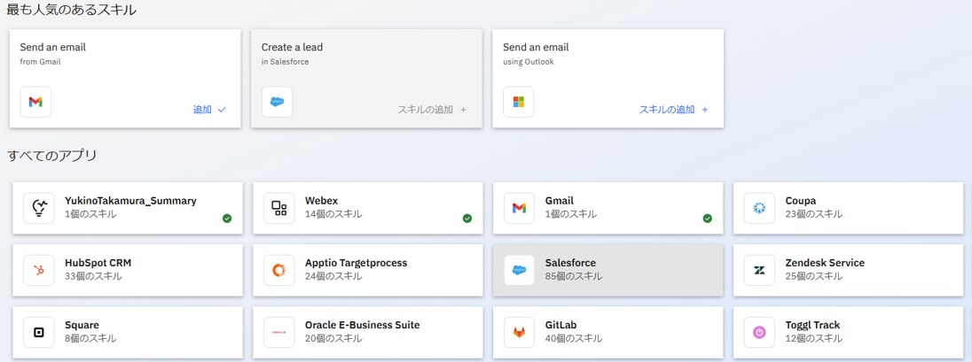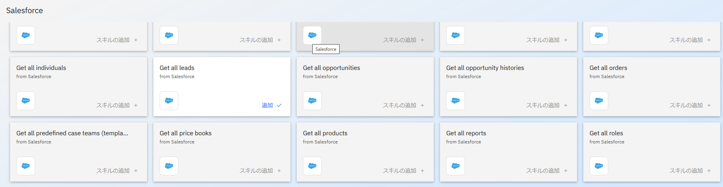 最後に、Salesforce へ議事録を登録するため、Salesforce のプリビルドスキルを追加します。