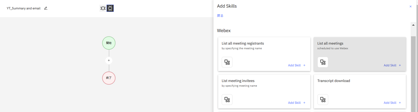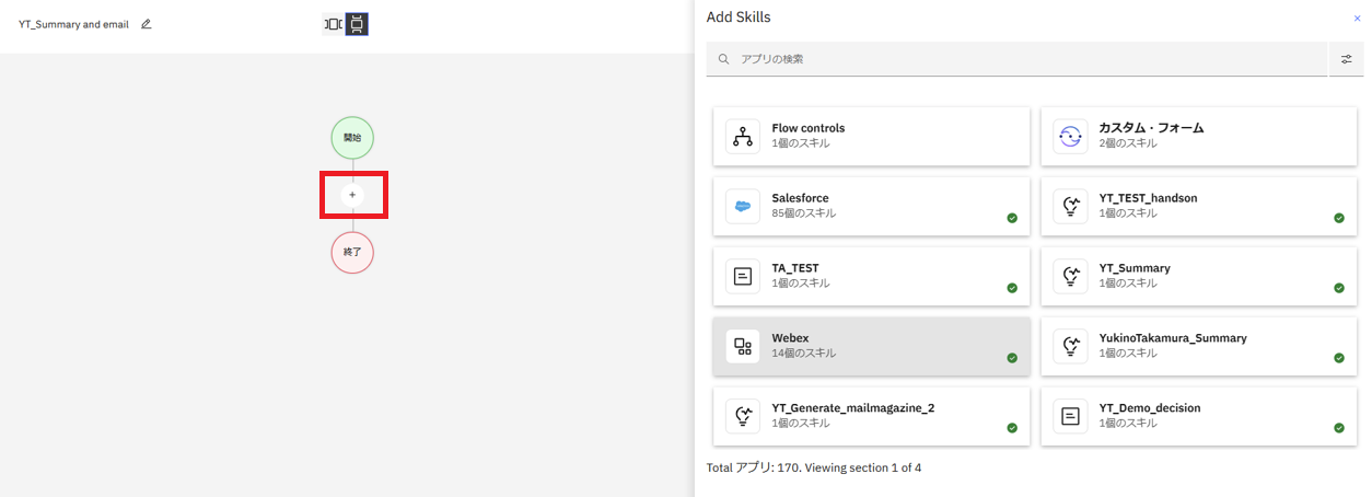 追加したスキルは開始から終了へ順番に実行され、画面の「+」をクリックするとスキルをフローに追加することができます。