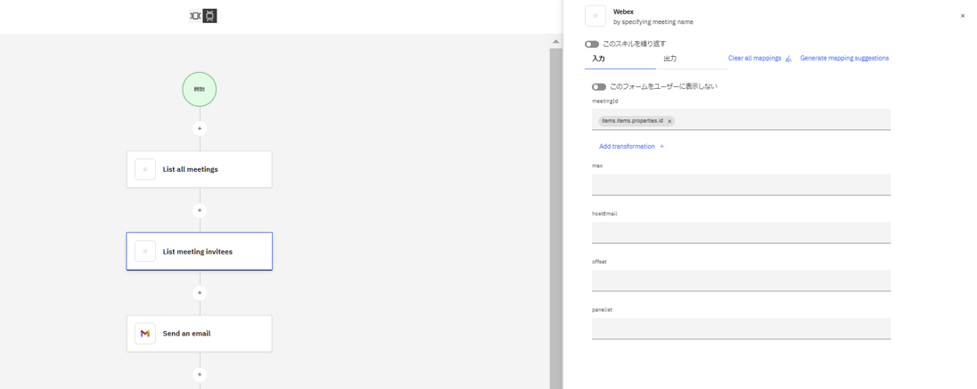 - 会議参加者のメールアドレスを取得するため「List meeting invitees」を同様に追加