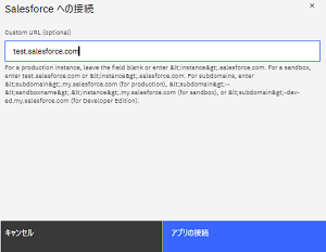 - (当検証ではSandbox環境を利用するため)「test.salesforce.com」を入力し「アプリの接続」をクリック