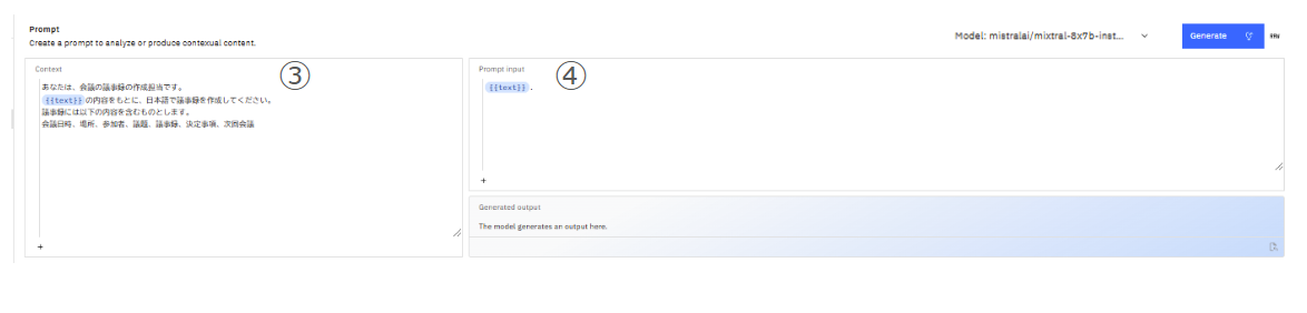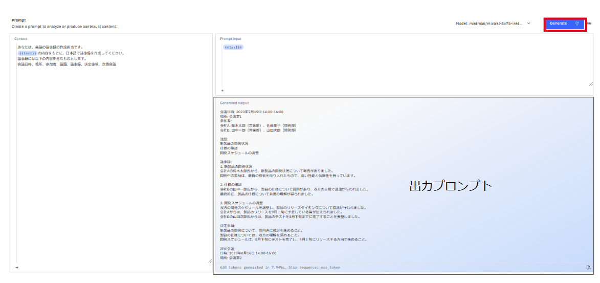 右上の「Generate」をクリックすると文章が生成され、Generated output(出力プロンプト)で文章を確認できます。
