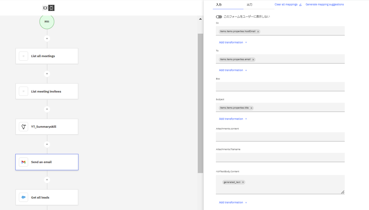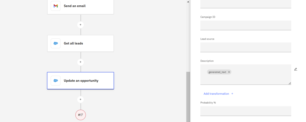 - 議事録生成する生成AIスキル、GmailのSend a emailスキル、SalesforceのGet all leads、Update an opportunityスキルの順に追加