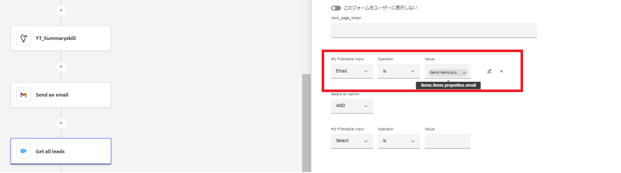 次に、Salesforce の Get all leads に入力引数を設定します。