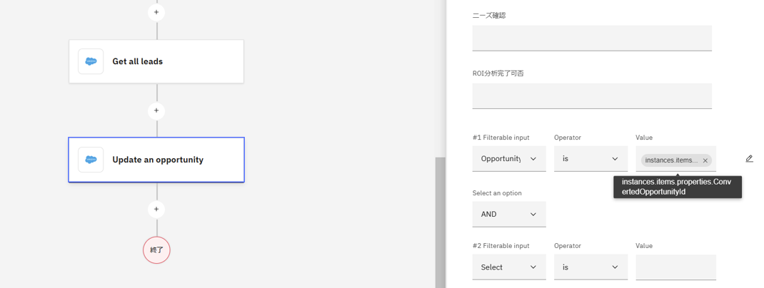 - Filterable input欄の”Value”の値に、Get all leadsの「ConvertedOpportunityid」を選択