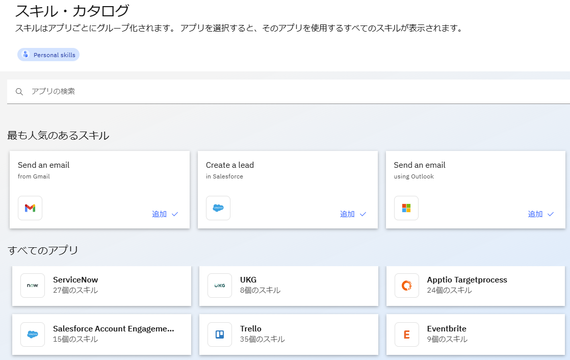 様々なアプリケーションと連携する30以上のアプリと1000近くのスキルがスキル・カタログとして製品に登録されており、すぐに利用することが可能です。