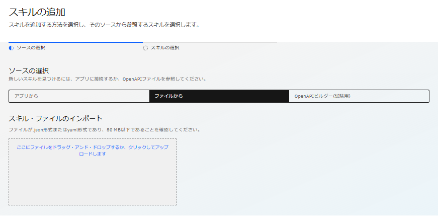 プリビルドスキルでは実現できない操作がある場合、 OpenAPI の仕様に準拠したサービスであれば、OpenAPI定義書を記述しスキルとして取り込むことが可能です。
