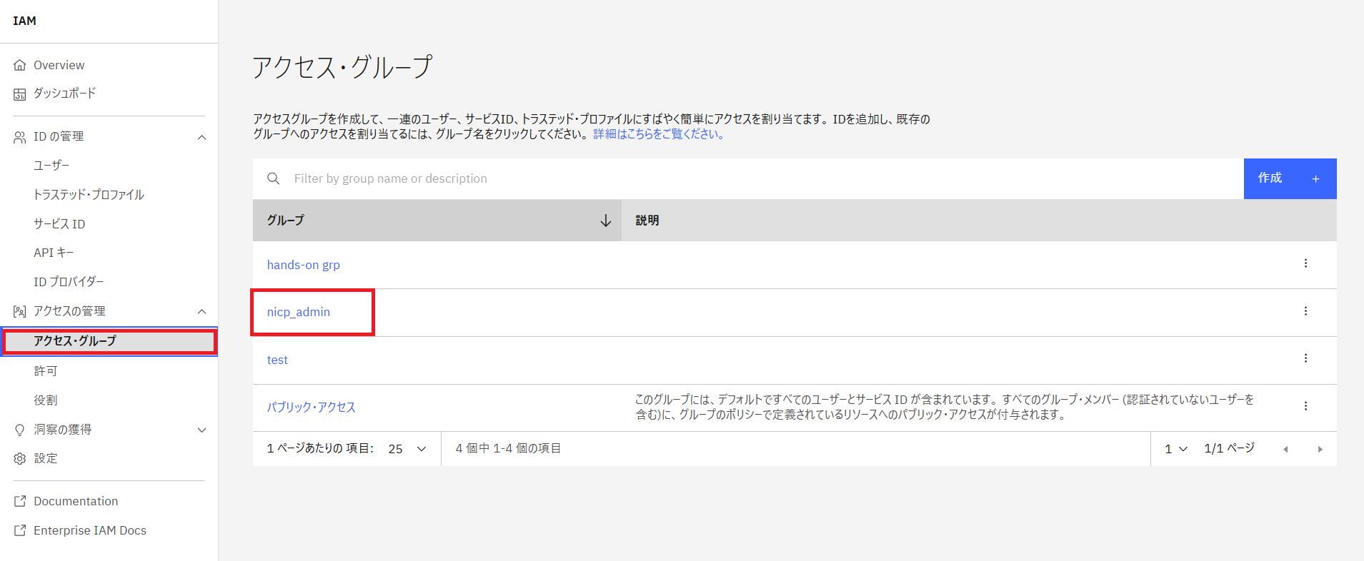 - IAMのメニューから「アクセスグループ」を選択し、権限を付与するアクセスグループをクリック(今回はアクセスグループに対して権限を設定)