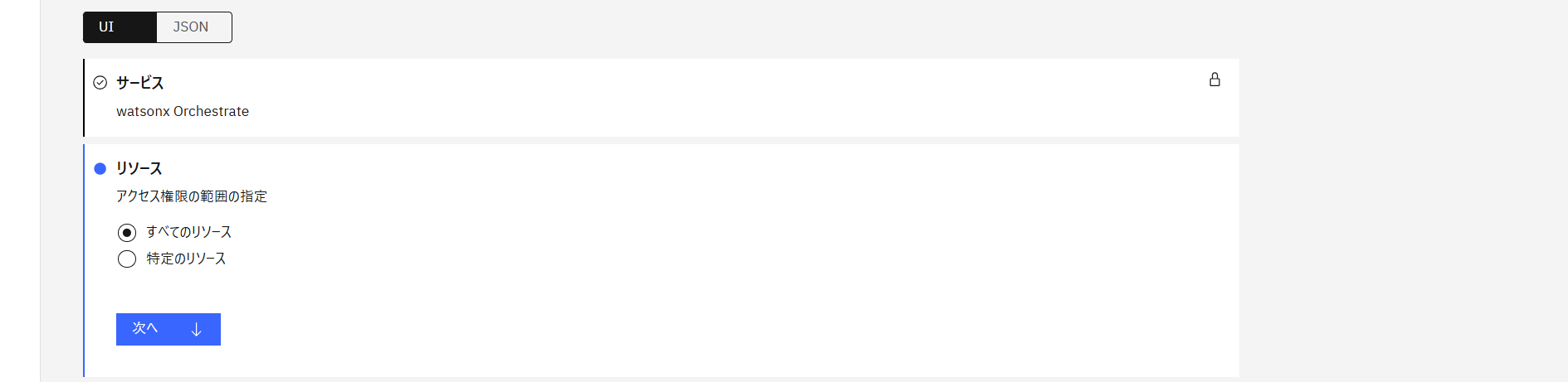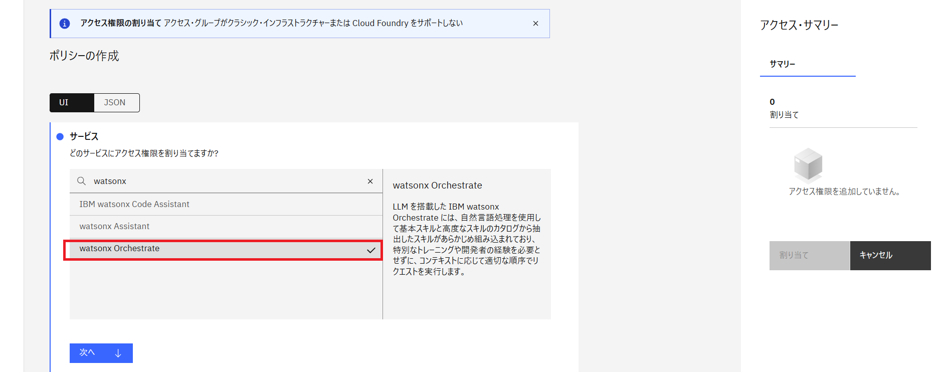 - ポリシー作成画面でサービスの「watsonx Orchestrate」にチェックを入れ「次へ」をクリック