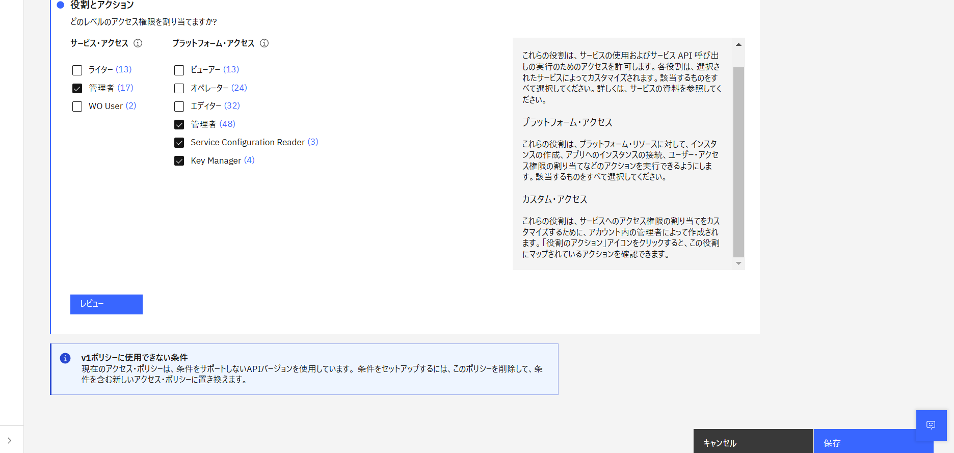 - 役割とアクションの画面で(今回は watsonx Orchestrate のすべての操作ができるようにするため)サービスアクセスを「管理者」、プラットフォームアクセスを「管理者」「Service Configuration Reader」「Key Manager」に設定し、「保存」をクリック