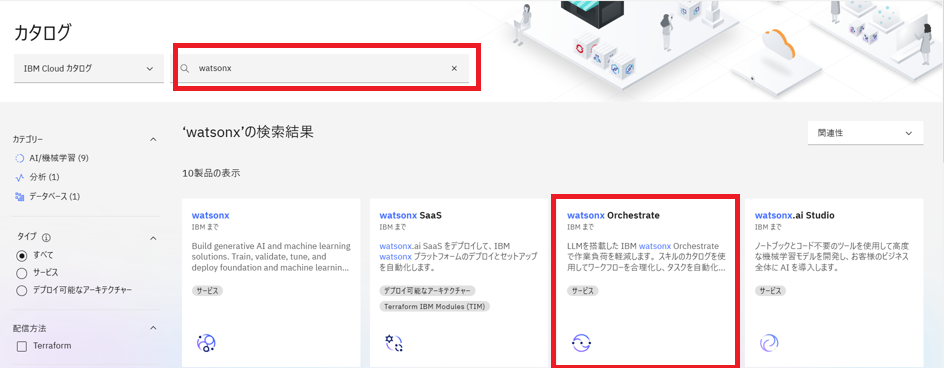 - カタログ画面の検索バーに「watsonx」と入力し、watsonx Orchestrateタイルをクリック