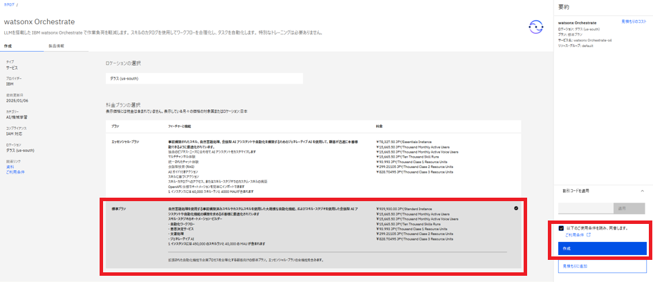 今回の検証環境では、SaaS提供の IBM Cloud版の watsonx Orchestrate を利用します(他にはAWS版があります)。プランは “Essentialsプラン” と “Standardプラン” の2種類で、今回は Standardプランを利用します。