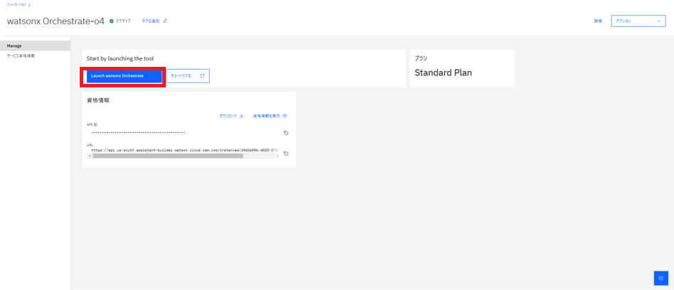 - (プラン確認後)「Launch watsonx Orchestrate」をクリックしてwatsonx OrchestrateのUI画面にアクセス