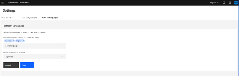 - 「Platform languages」タブで「Add a language」を選択し、”Default languages for all users” を「Japanese」に設定し「Save」をクリック