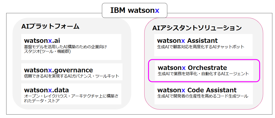 まず、IBM watsonx製品群における watsonx Orchestrate の位置づけについてご紹介します。