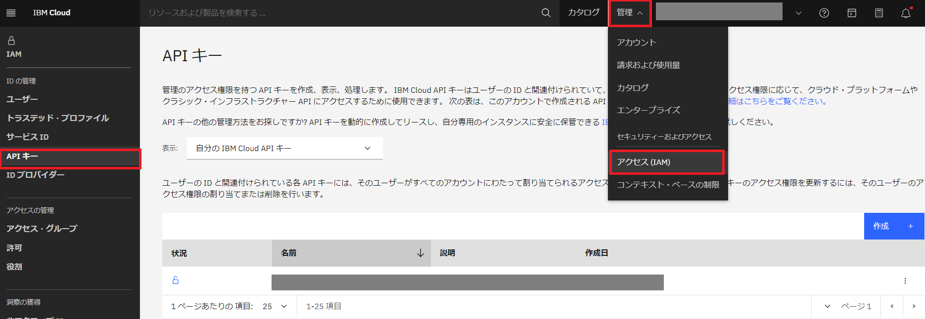 - APIキーの取得は IBM Cloud画面「管理」⇒「アクセス(IAM)」をクリックし、「APIキー」をクリックします。