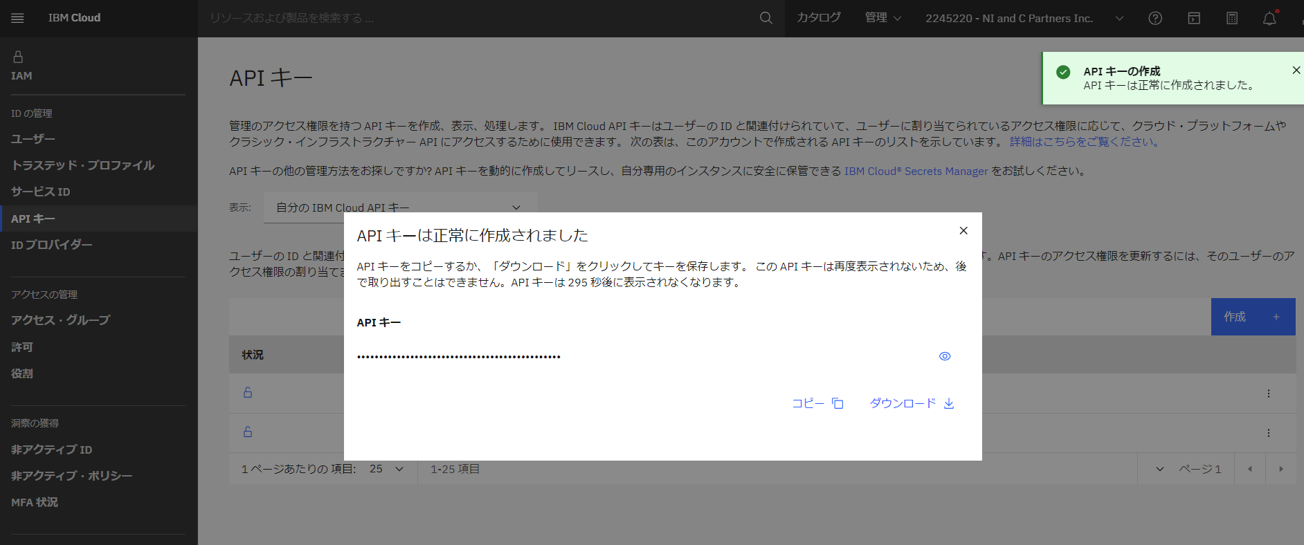 - APIキーが作成されたので、コピーして手元にメモしておきます。