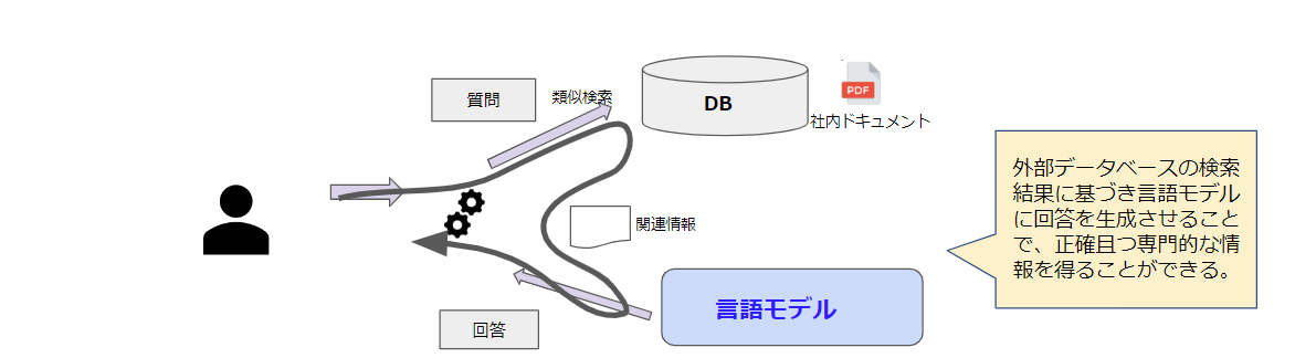 図2のように、外部データをデータベースに保存しその検索結果に基づいて言語モデルに回答を生成させることで、より正確な情報を得ることが可能です。