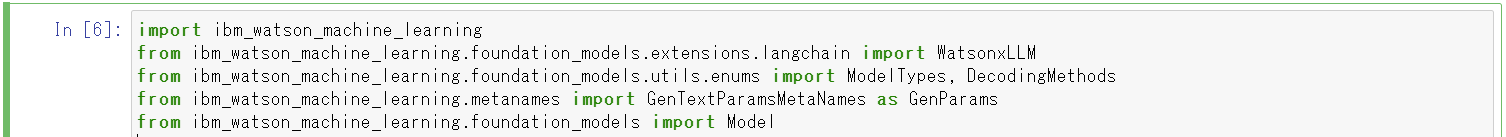 - LangChain で使う Watson Machine learning のモジュールを複数インポートします。
