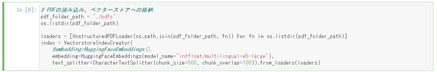 - pdfsフォルダにある PDF を読み込み、ベクターストアへ取り込みます。