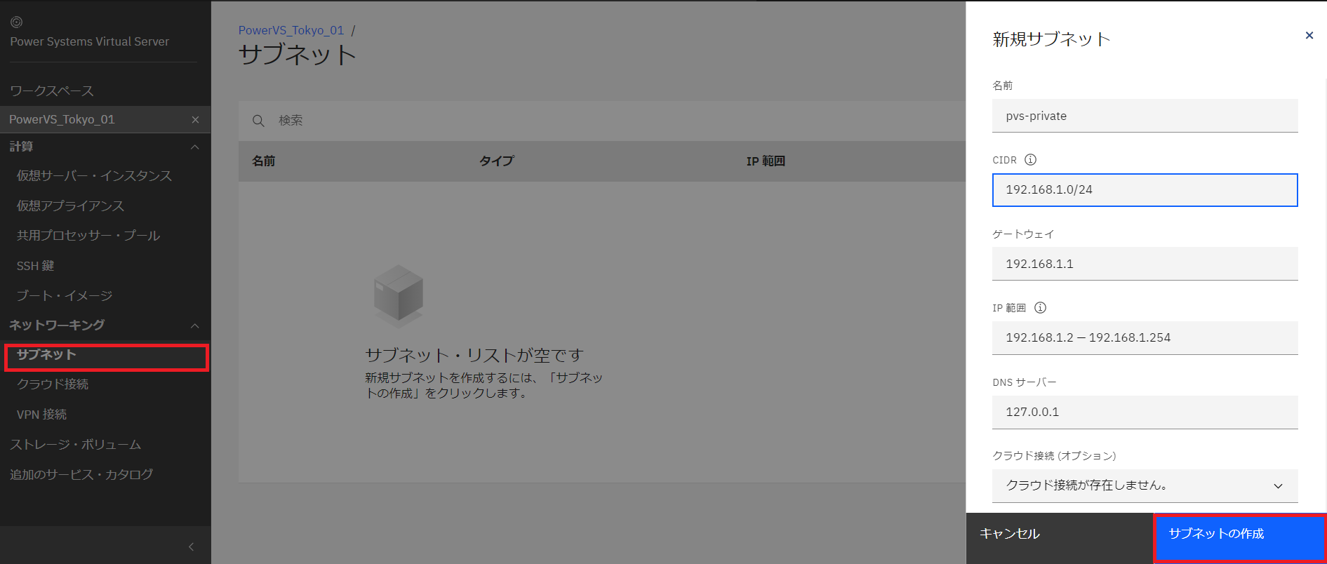- サブネット:PowerVSで作成したプライベートサブネット