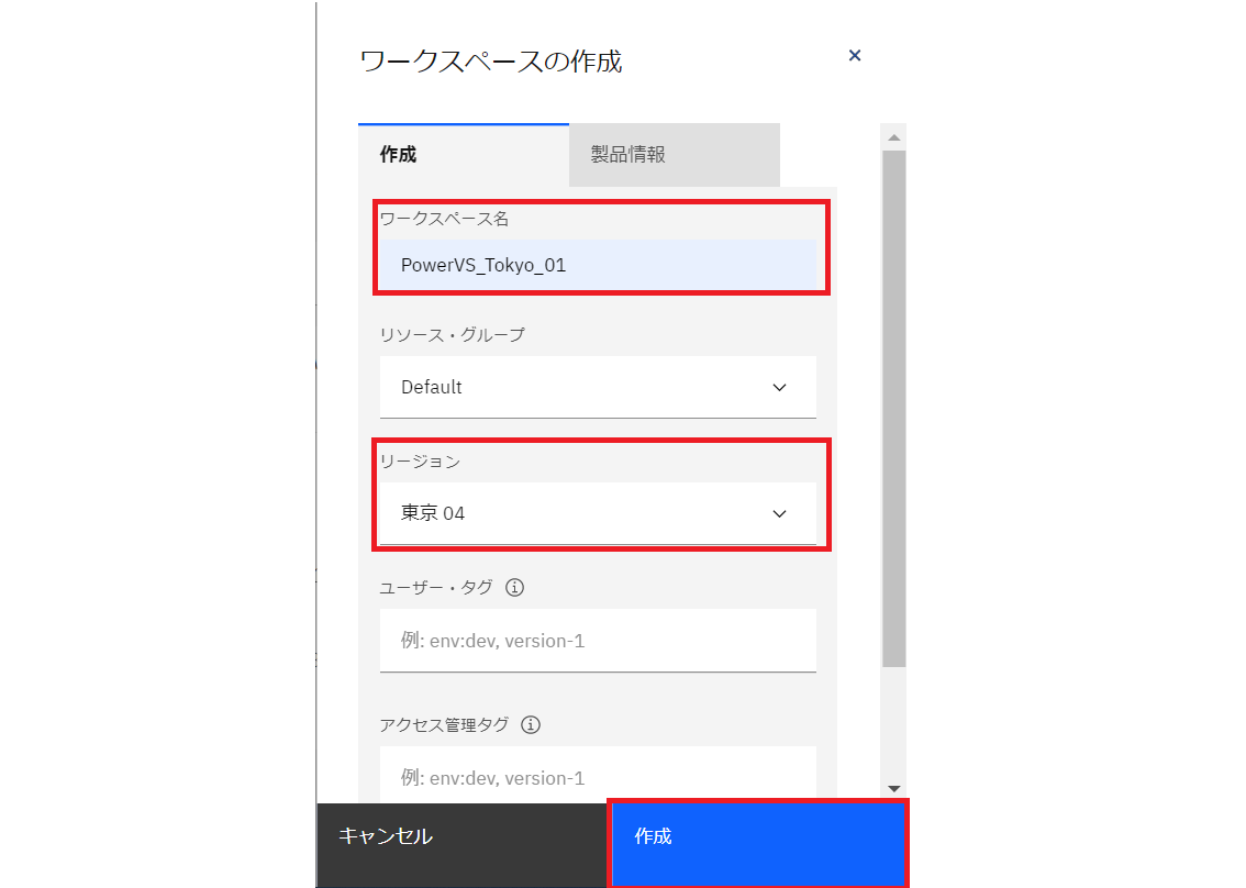 ワークスペースは、PowerVSのデプロイする場所をゾーン毎に作成できる無償の作業環境です。任意のワークスペース名を入力し、リージョンは “東京04” を選択して作成します。