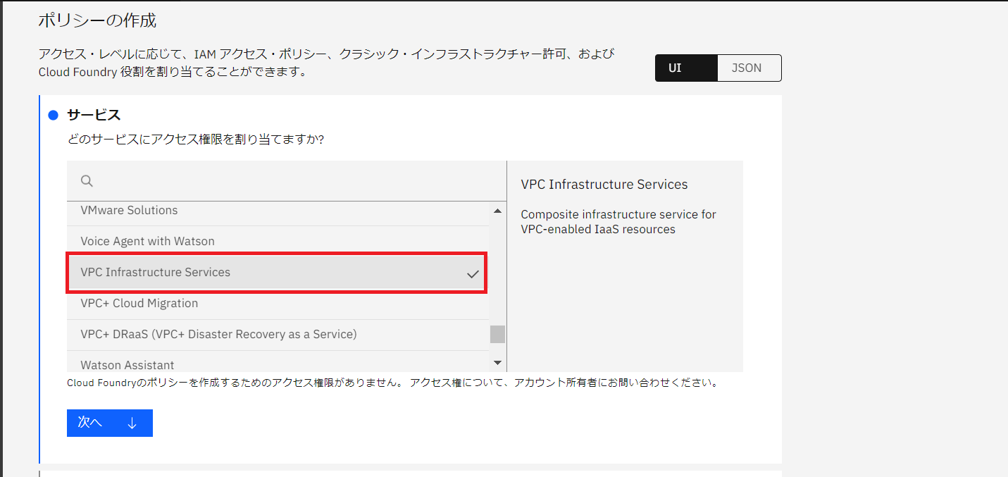 ・「ポリシーの作成」でサービスから「VPC Infrastructure Services」を選択します。