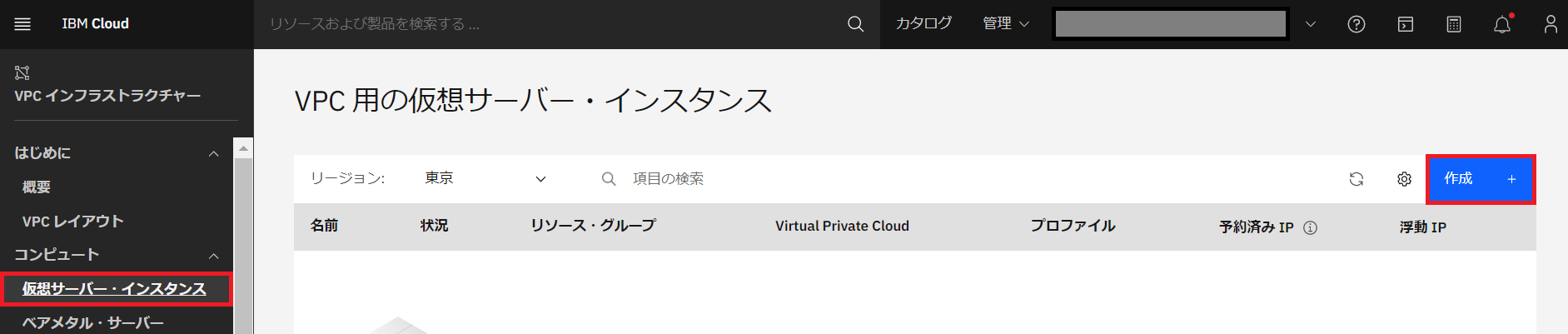 左側のメニューから「仮想サーバ・インスタンス」を選択し「作成」をクリックします。
