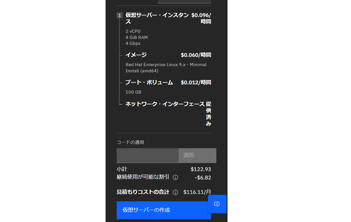 ・パラメーターを入力したら右側画面の金額を確認し「仮想サーバの作成」をクリックします。