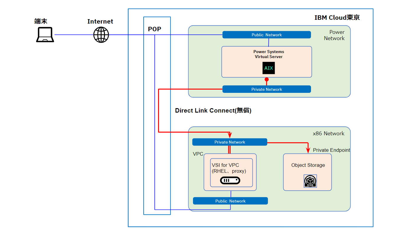 図の赤い線が今回検証したプライベートネットワーク経由の PowerVS から IBM COS の接続です。青い線はパブリックネットワーク経由で端末から各サービスに接続する経路になります。