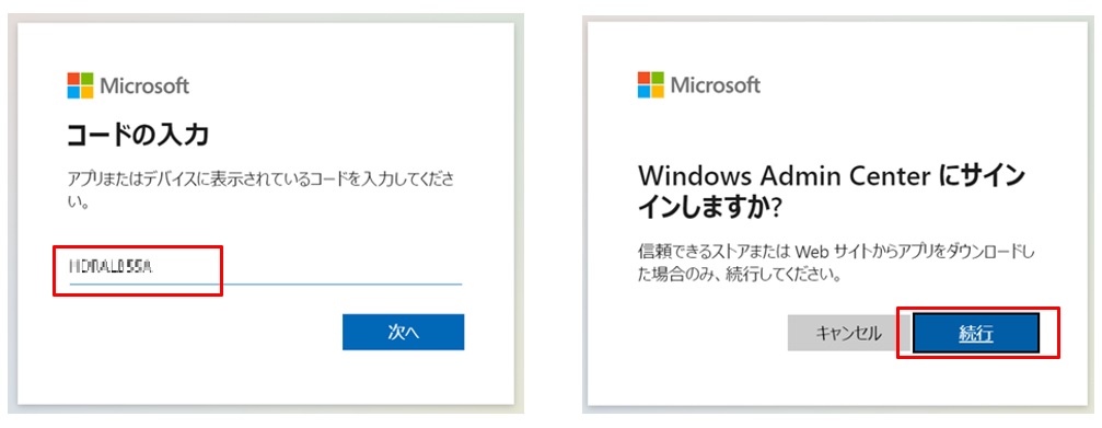 するとブラウザ画面に切り替わるので、コピーしたコードを入力し[続行]します。