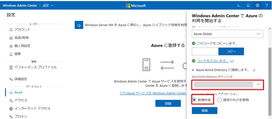 再びWACに戻ると[Azure Active Directory]にテナントIDが表示されるので、Azure Portalで確認したIDであることを確認し、”新規作成”を選択して[接続]します。