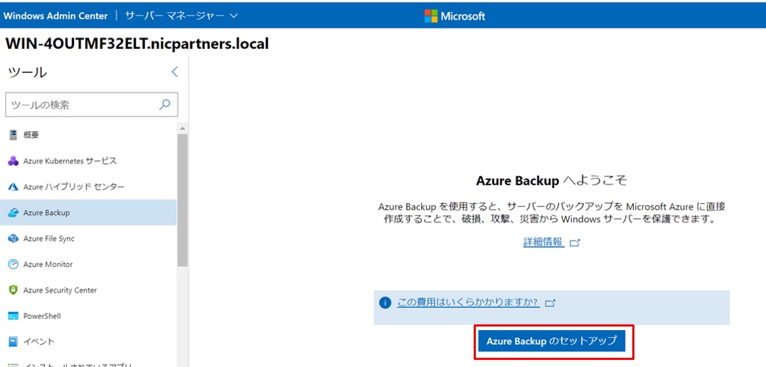 WACサーバーにて、バックアップを行うAzure Stack HCI上の仮想サーバーに接続し、左ペインの[Azure Backup]を選択し、右ペインの[Azure Backupのセットアップ]をクリックします。