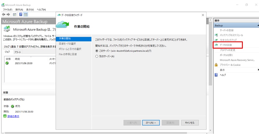 Azure Backupアプリを起動し、右ペインにある「データの回復」をクリックします。